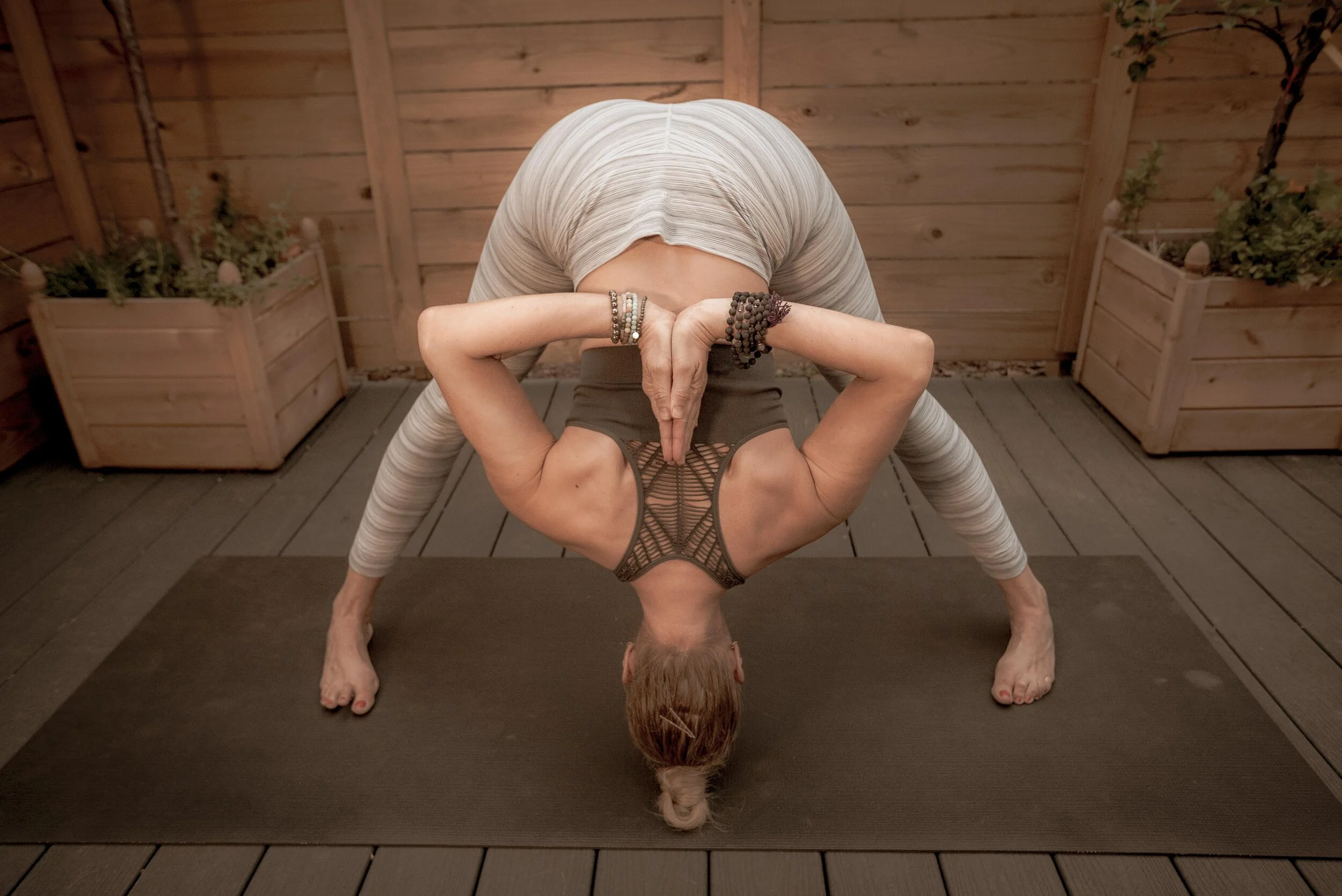 A woman in workout clothes is doing a backbend yoga pose on a black mat on a wooden deck, reaching one arm forward. She is wearing bracelets and looking towards the camera, with a wooden fence and potted plants in the background.