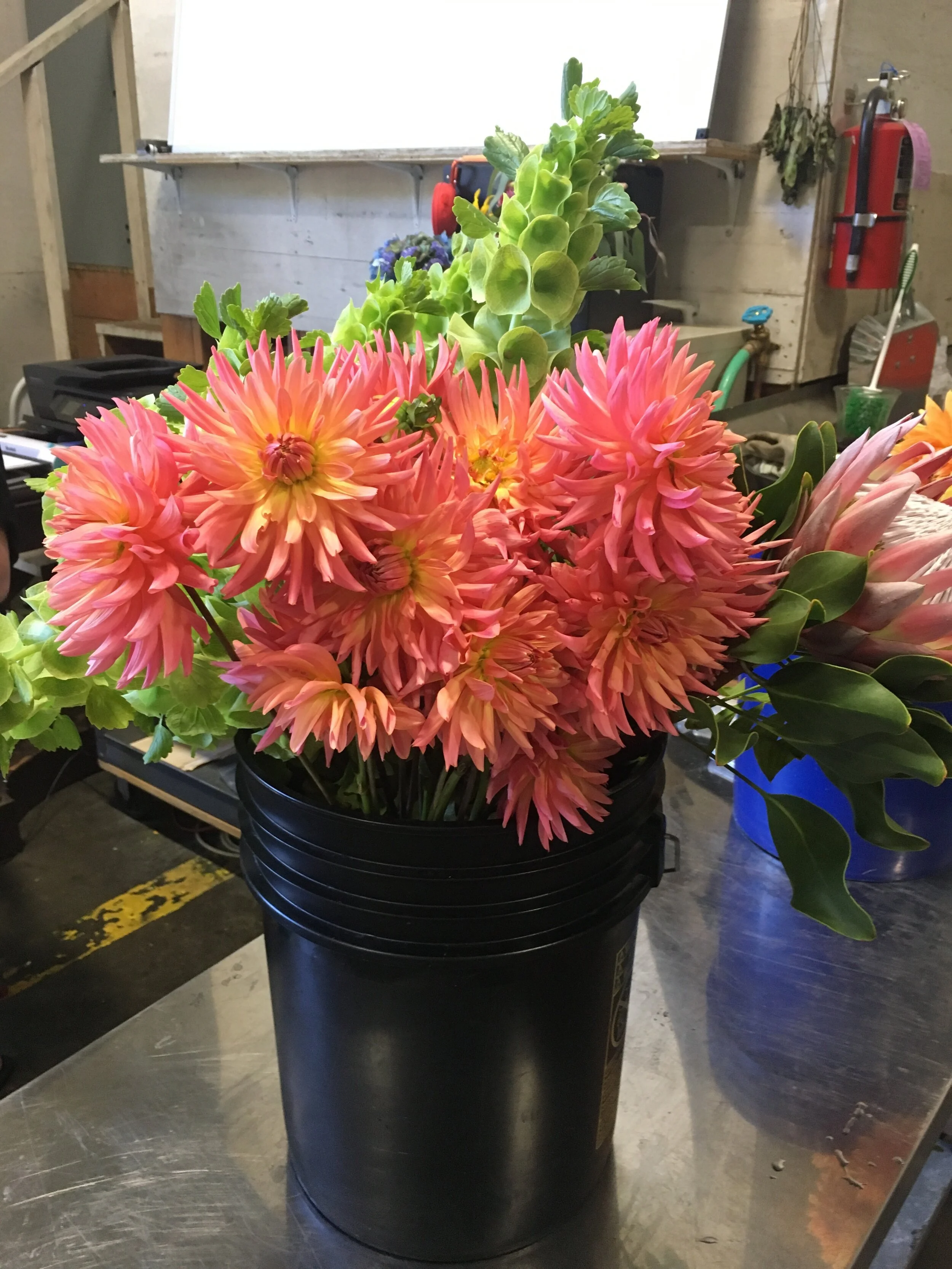 A black bucket filled with pink and orange dahlias, green leaves, and a single green succulent plant. The background shows a workbench, whiteboard, and workshop tools.