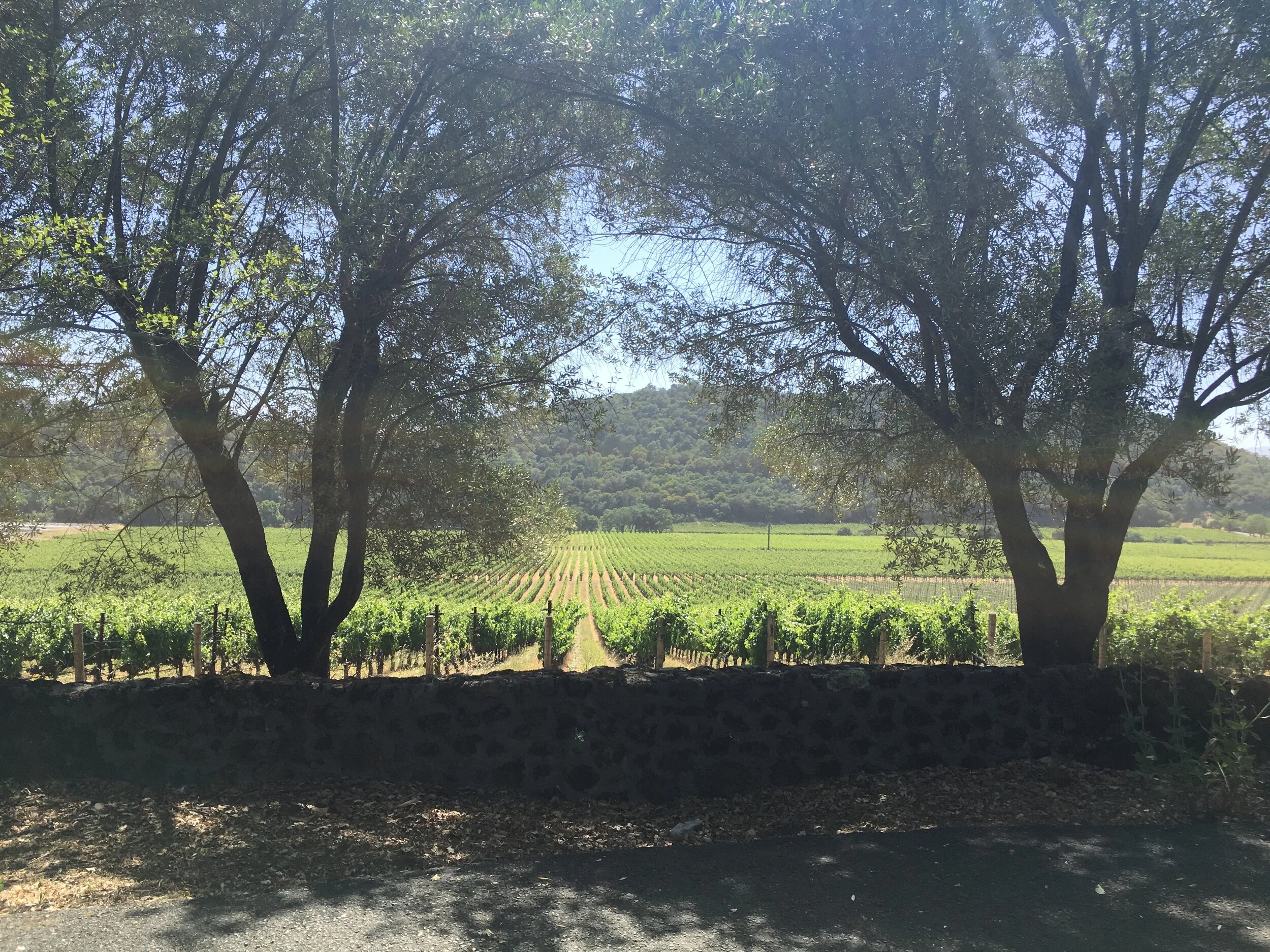 Vineyard with rows of grapevines, two large trees in the foreground, and a hill in the background, under a clear blue sky.