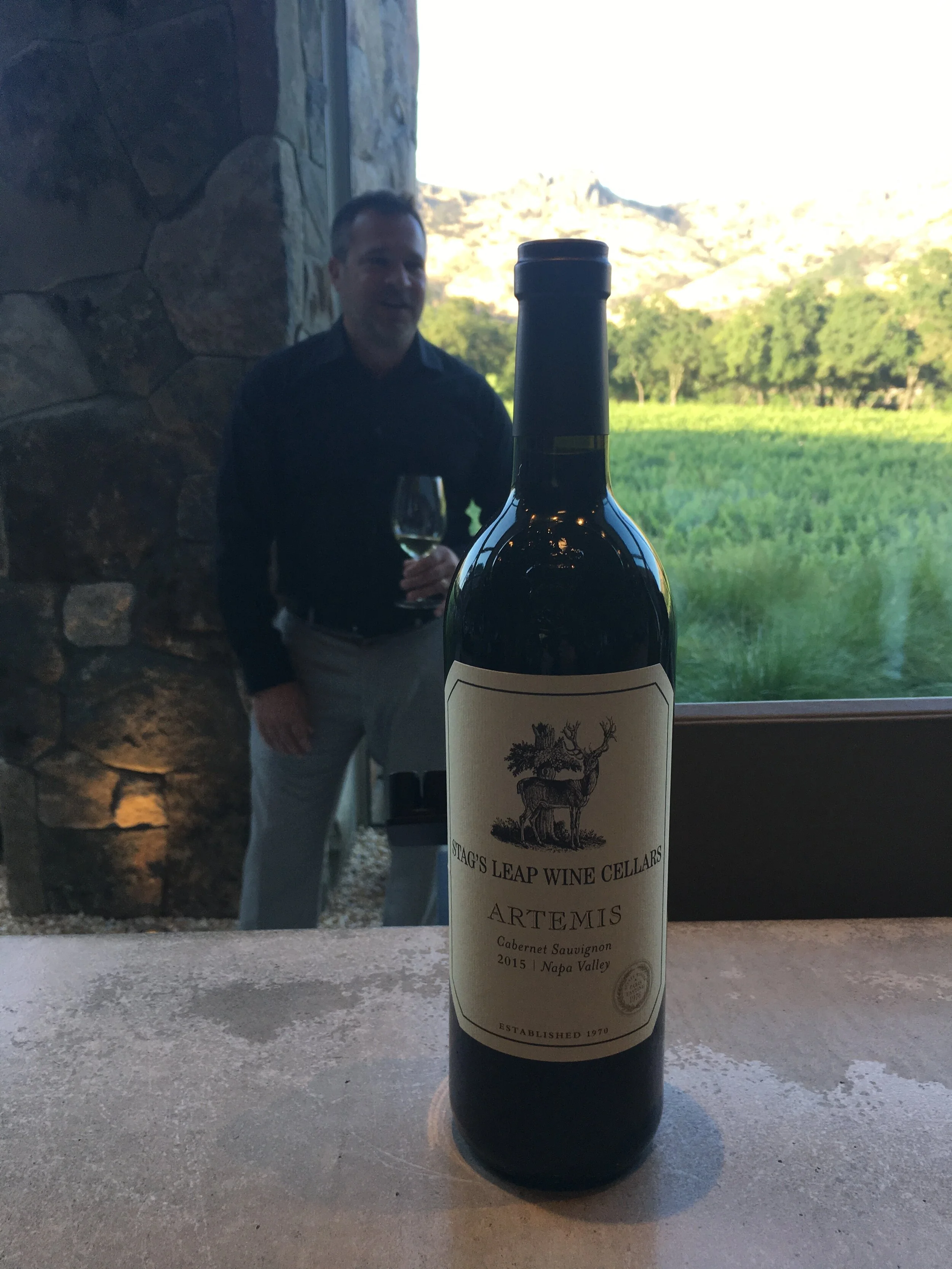 A bottle of Artemis Cabernet Sauvignon wine from Stags Leap Wine Cellars in Napa Valley, 2015, placed on a table with a man holding a glass of wine in the background, with vineyard scenery outside.