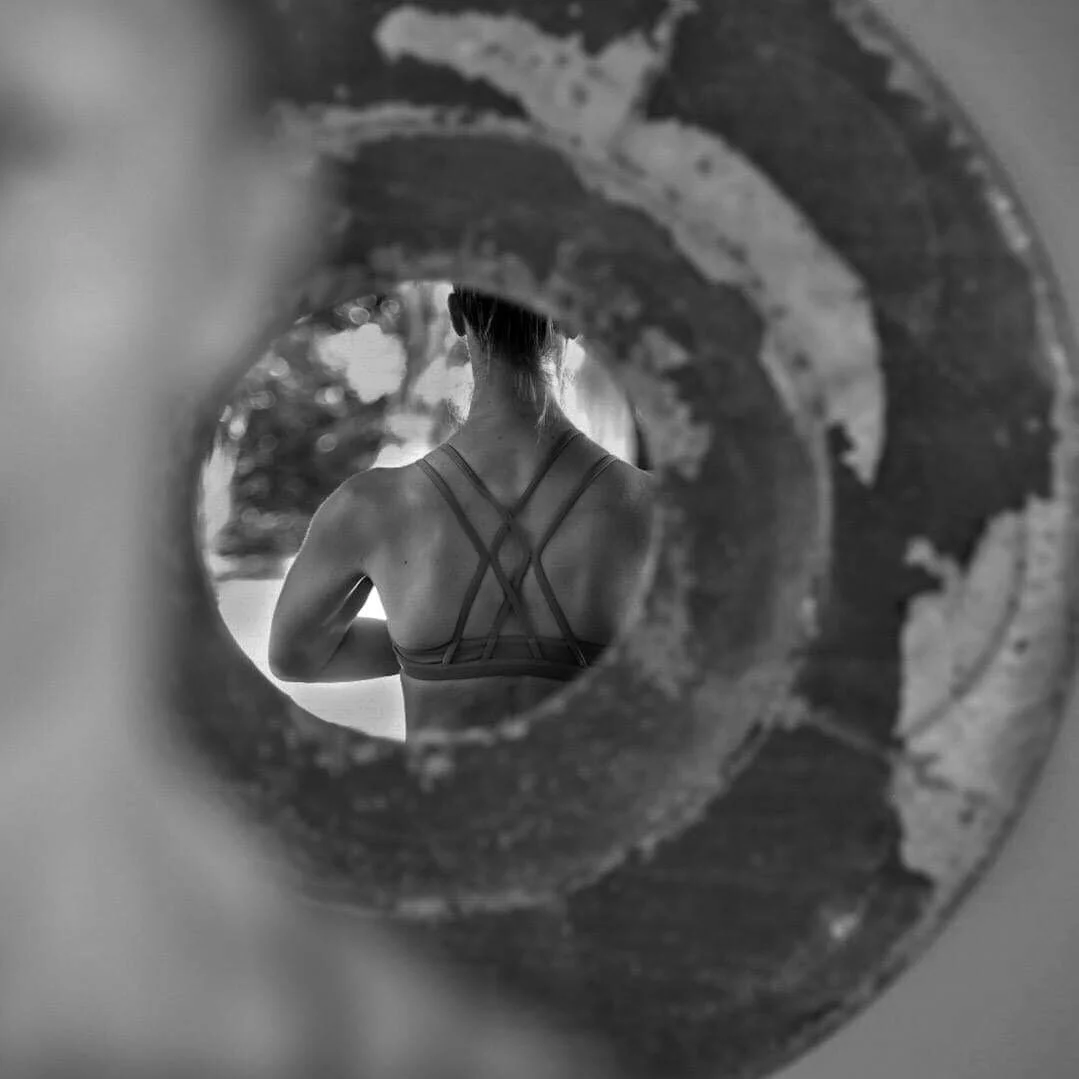 Black and white photo of a woman in a sports bra, viewed from the back, seen through a circular opening in a weathered pipe or object.