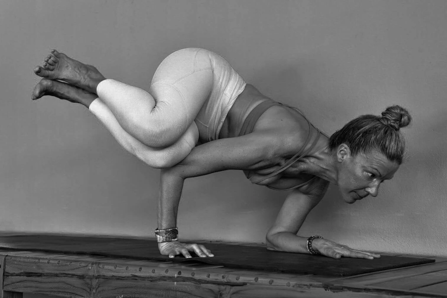 A woman performing a challenging yoga pose on a wooden surface, balancing on her hands with her legs bent and elevated behind her.