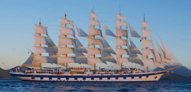 A large sailing ship with multiple masts and white sails sailing on the ocean.