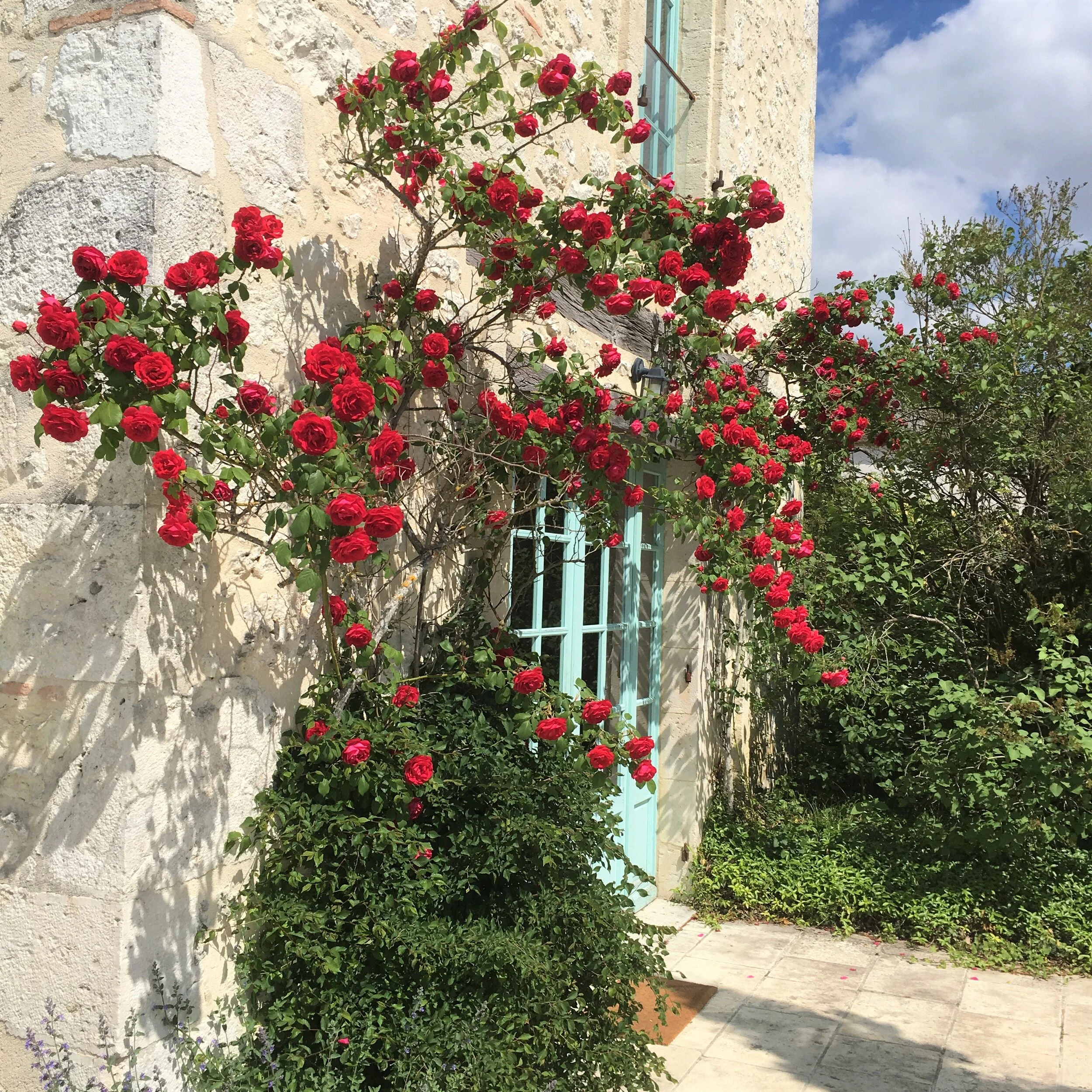 A stone building with a light blue window and door, surrounded by blooming red roses and greenery, under a partly cloudy sky.