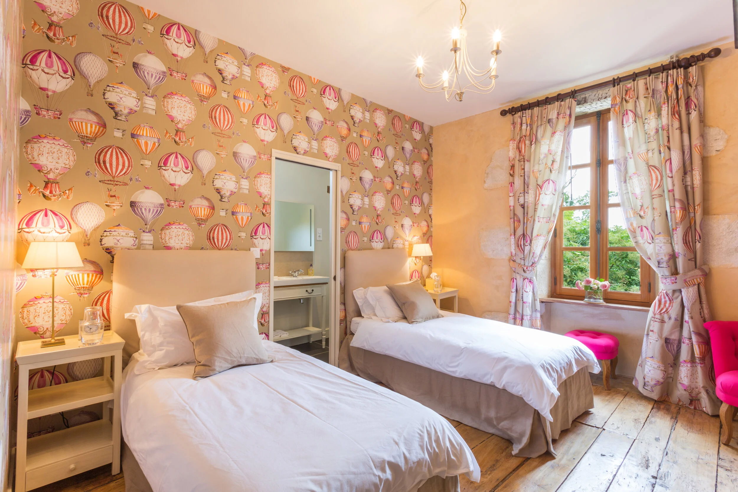 Bedroom with two single beds with beige headboards, pink hot air balloon patterned wallpaper, a window with pink and beige curtains, sunlight coming through, a pink stool, and lamps on nightstands.
