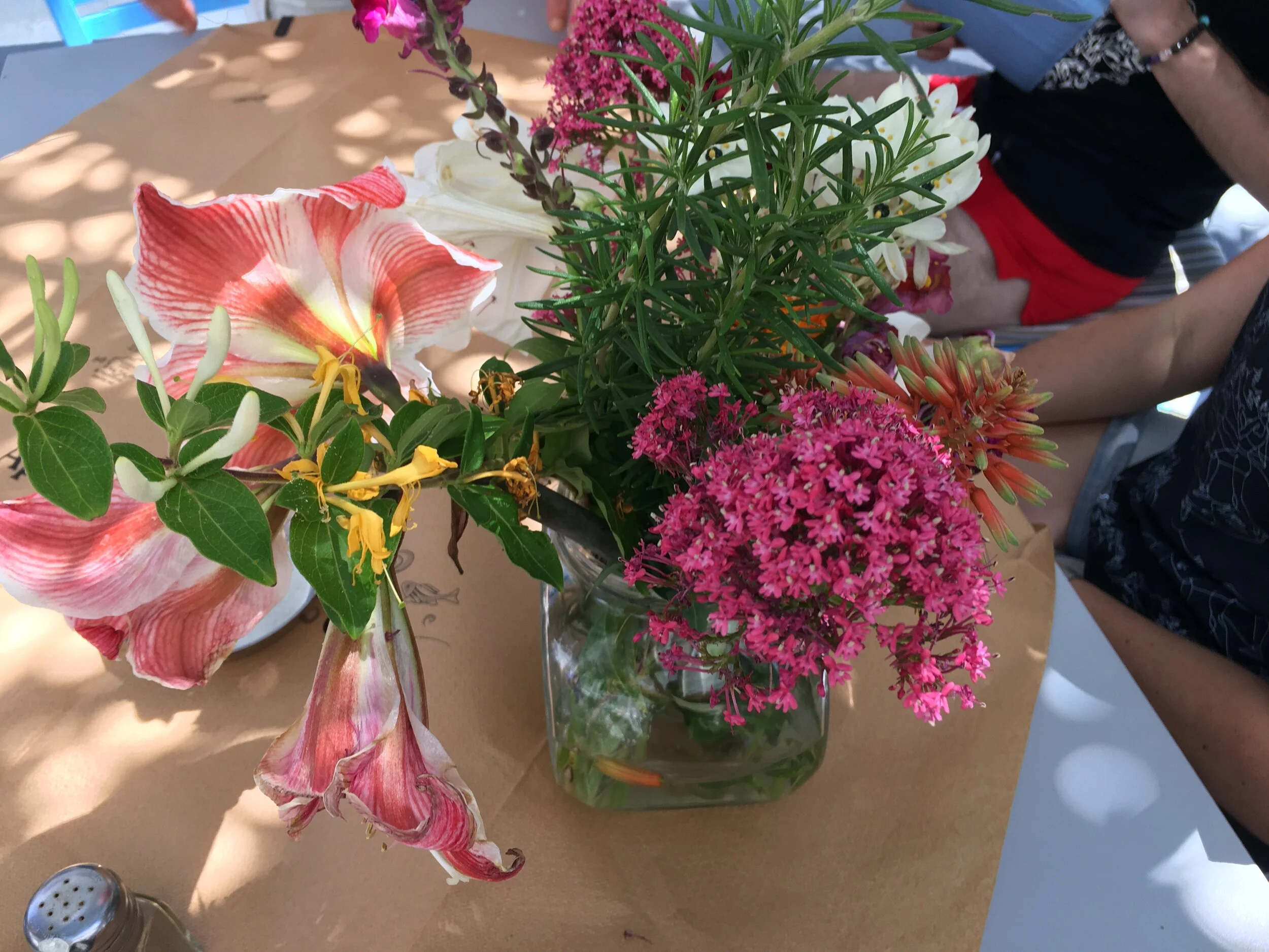A bouquet of various colorful flowers in a glass vase on a table, with a blurred person in the background.
