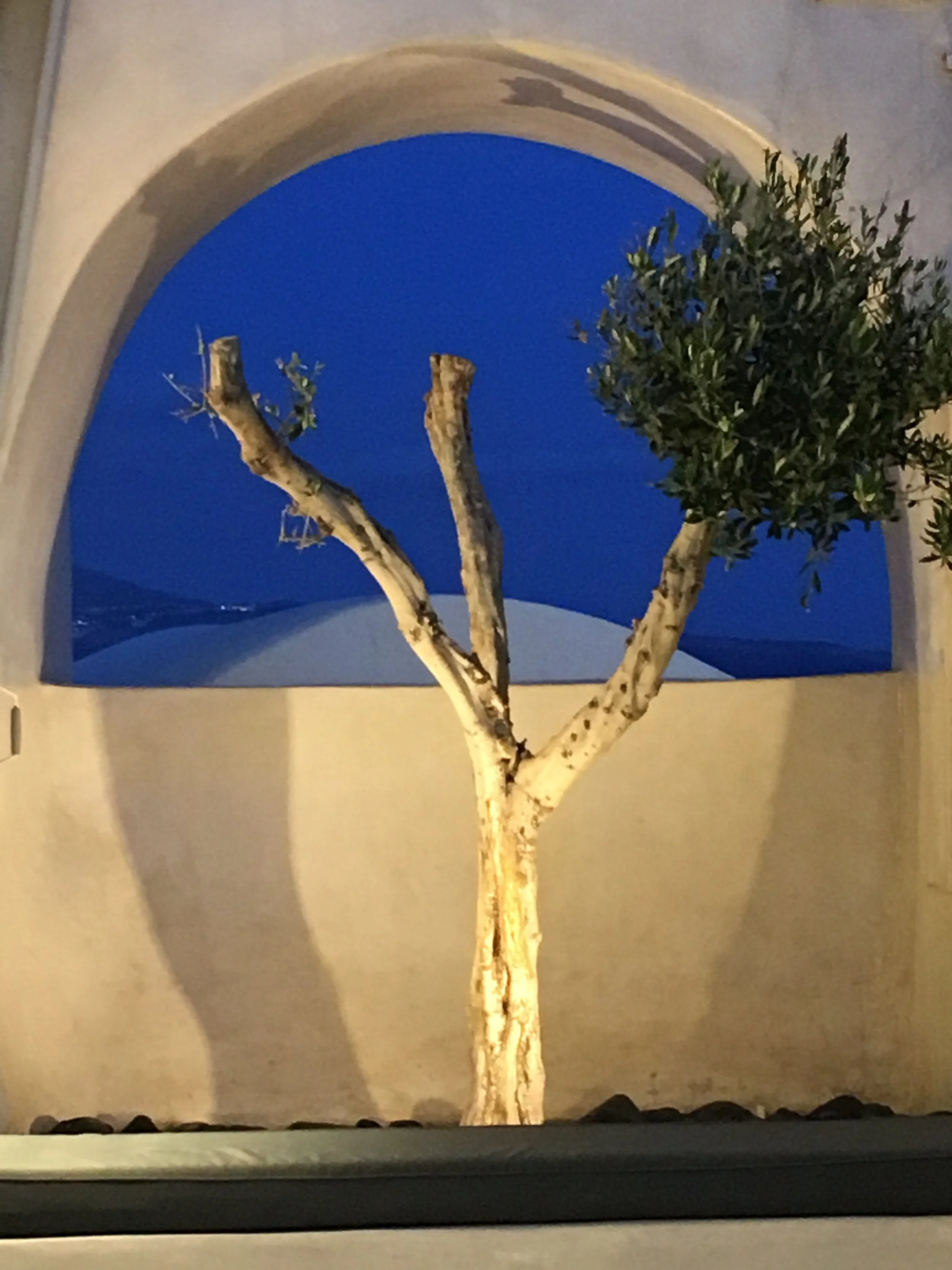 A tree with a light-colored trunk and two main branches, one sparse with a few leaves and a spider web, the other full of green leaves, seen through a large arch-shaped window at night.