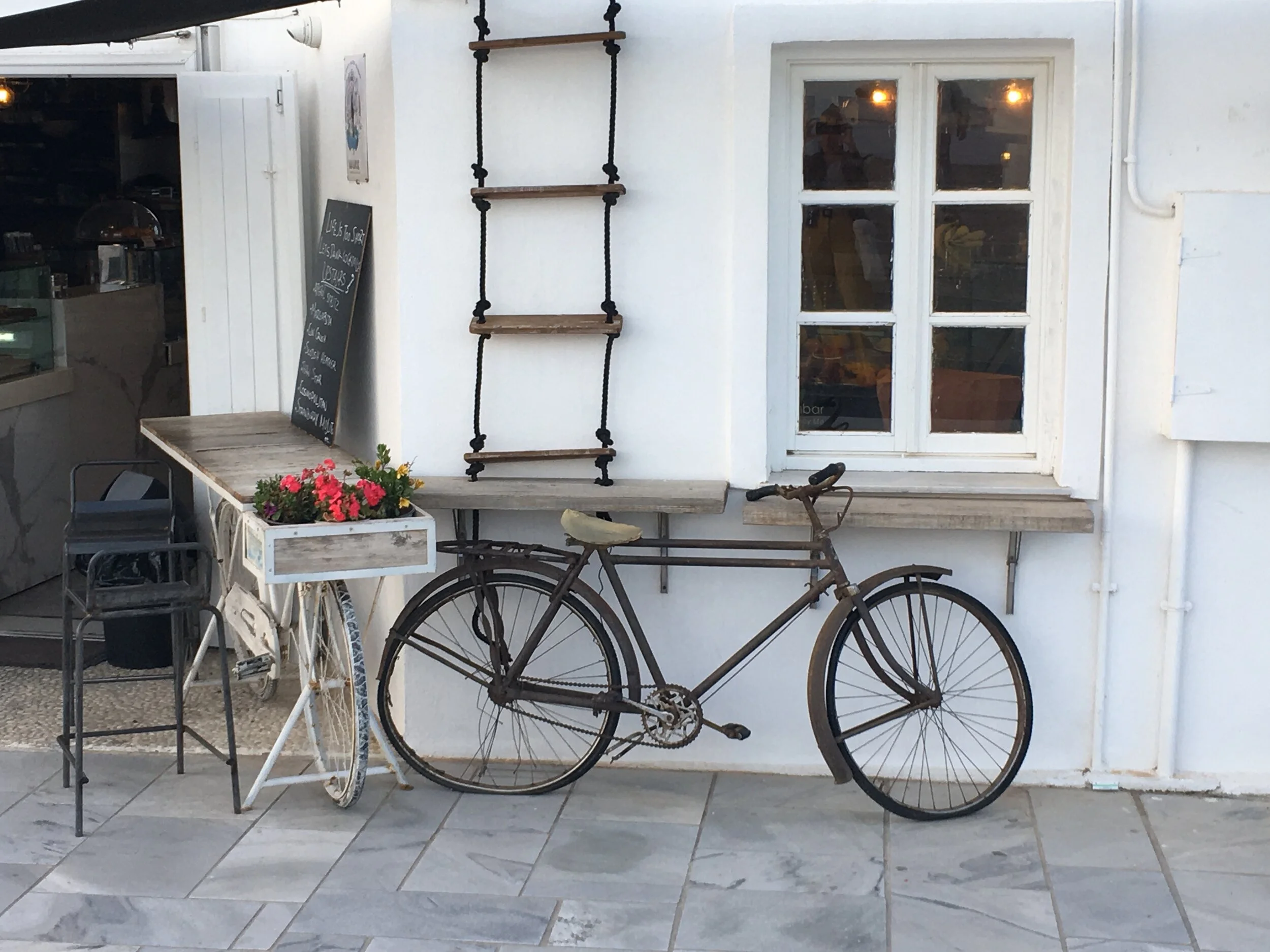 Vintage bicycle leaning against white wall outside a café, decorated with a small white cart filled with pink flowers, a blackboard sign, a wooden ladder, and a window with four panes.