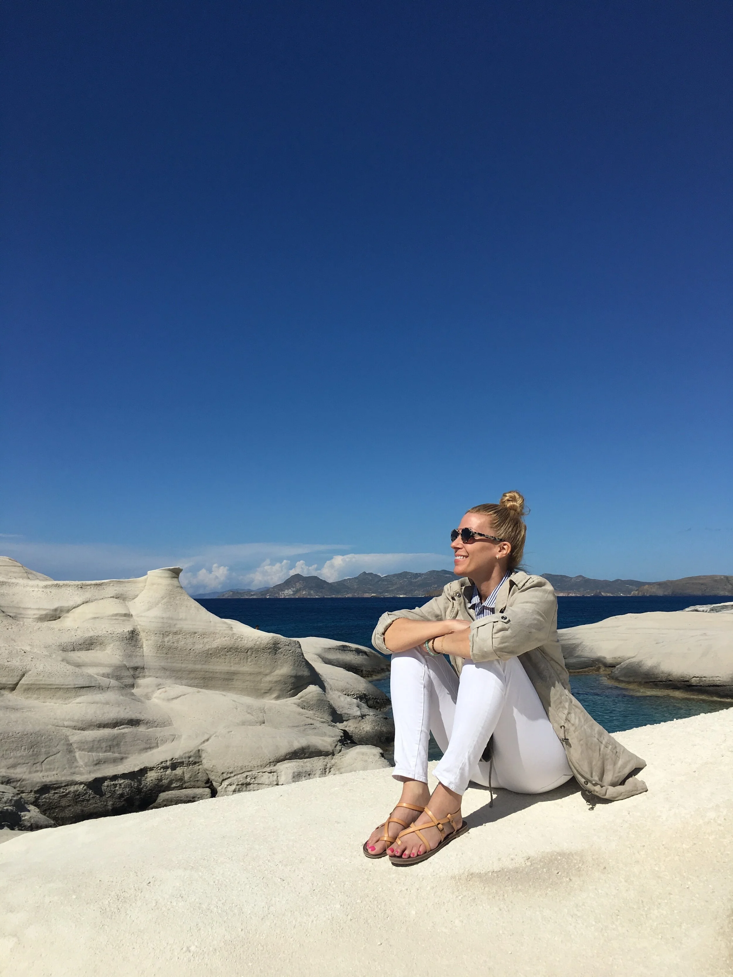 Woman sitting on white rocks near the sea under a clear blue sky, wearing sunglasses, a gray jacket, white pants, and tan sandals, smiling and enjoying the sunny day.
