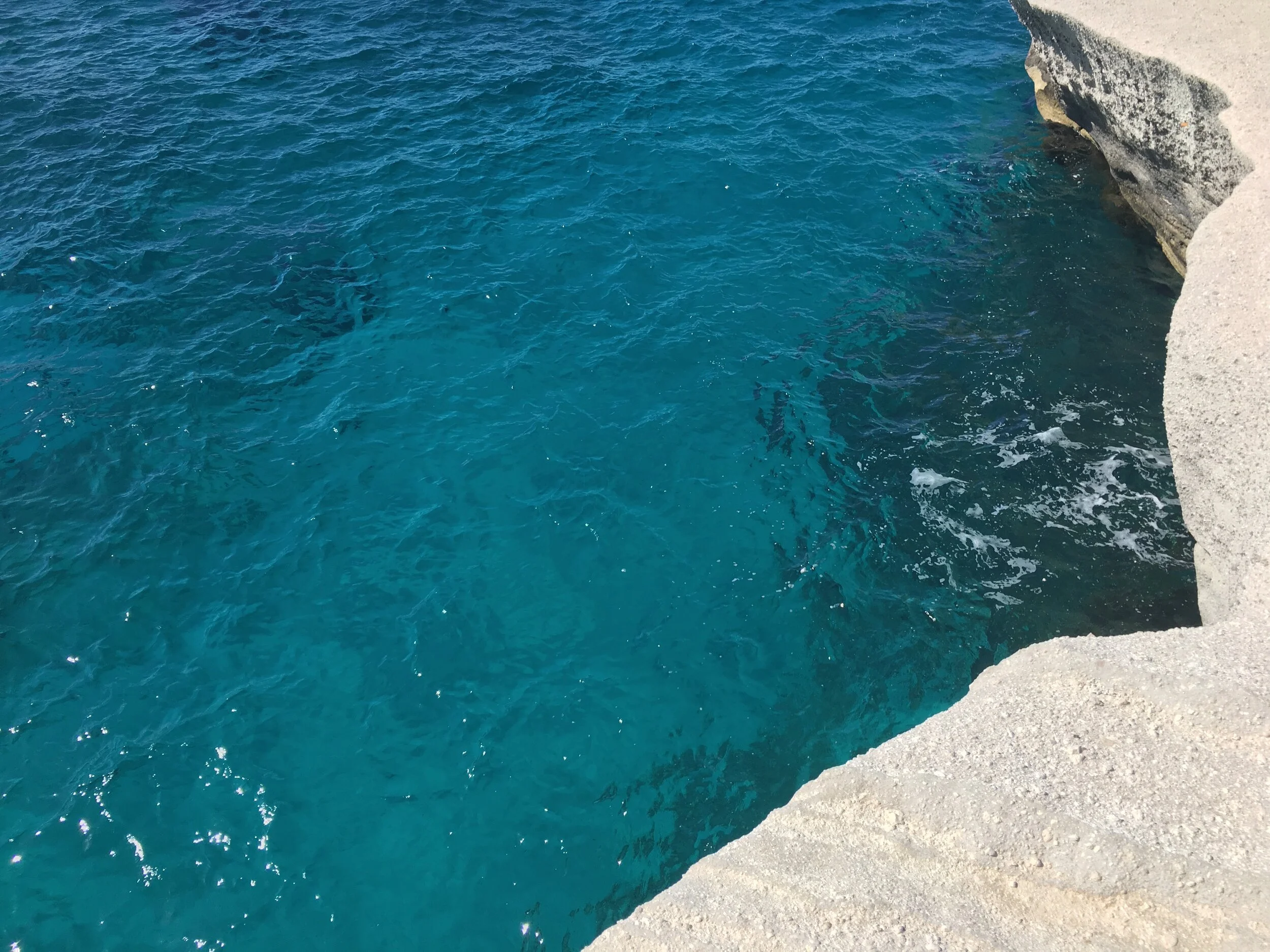 Clear blue water near rocky shoreline with waves gently lapping against the rocks.