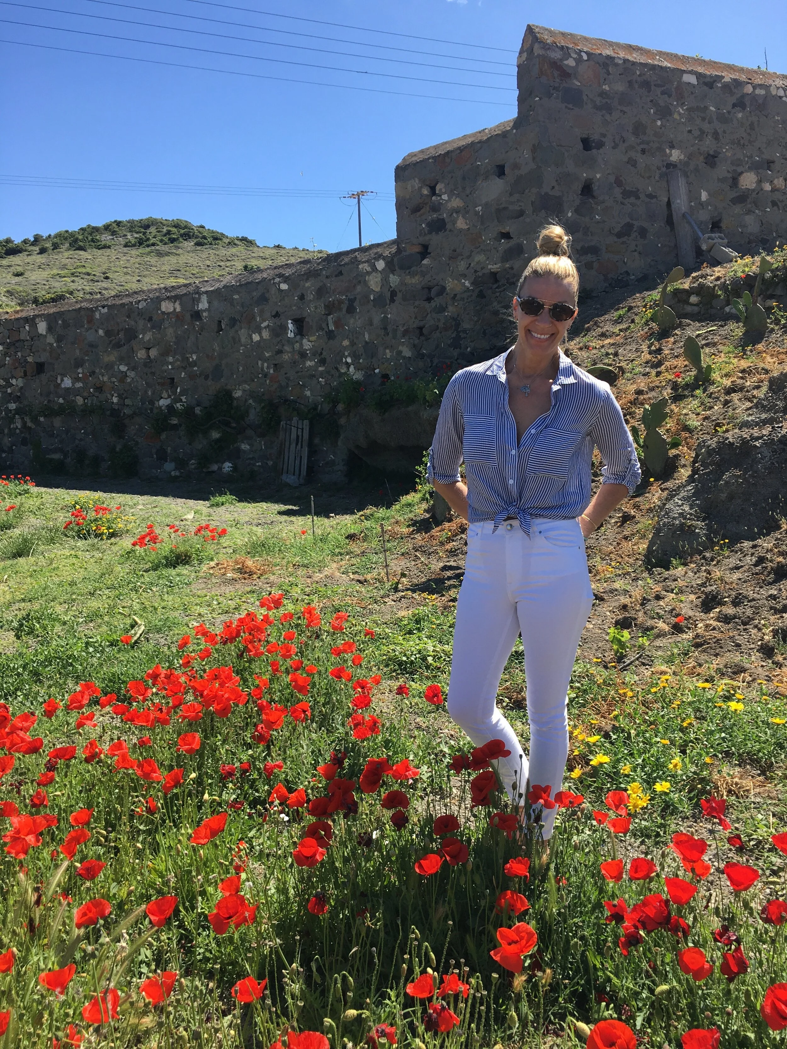 A woman standing among red poppies and yellow flowers on a sunny day, with an old stone building and hills in the background.