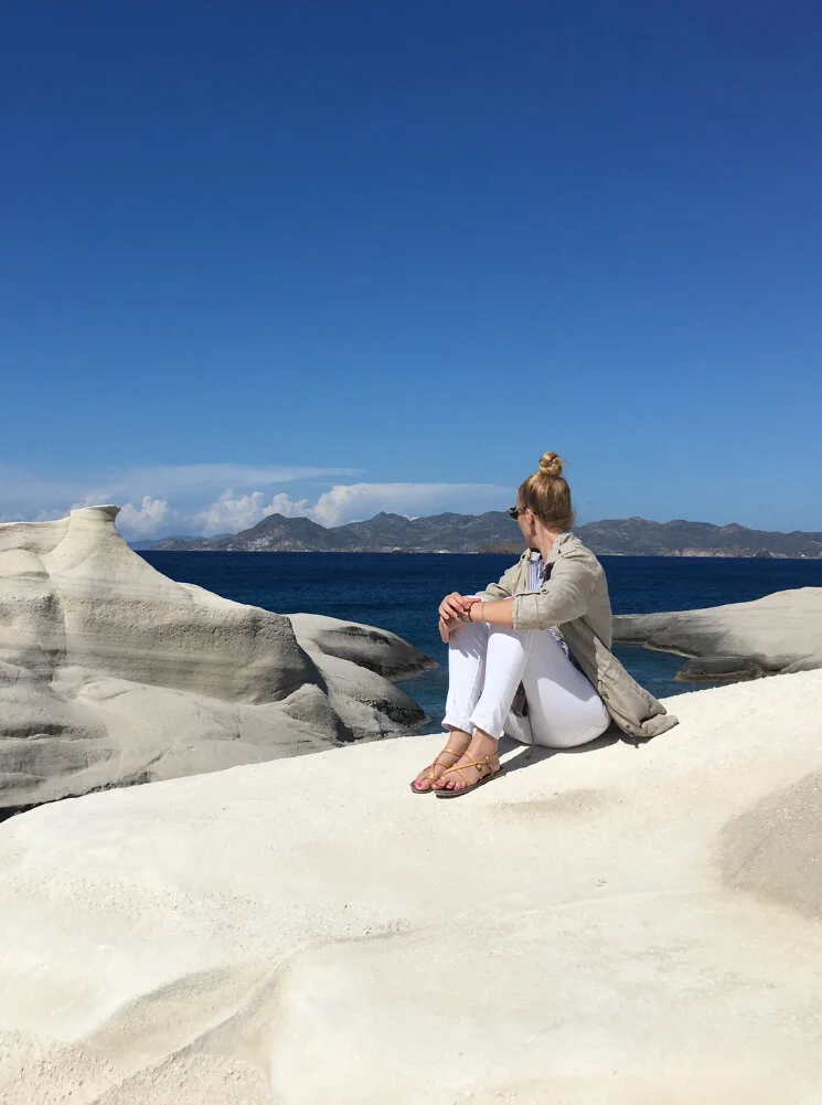 A woman sitting on white rocks near the ocean, looking at the water and distant mountains under a clear blue sky.