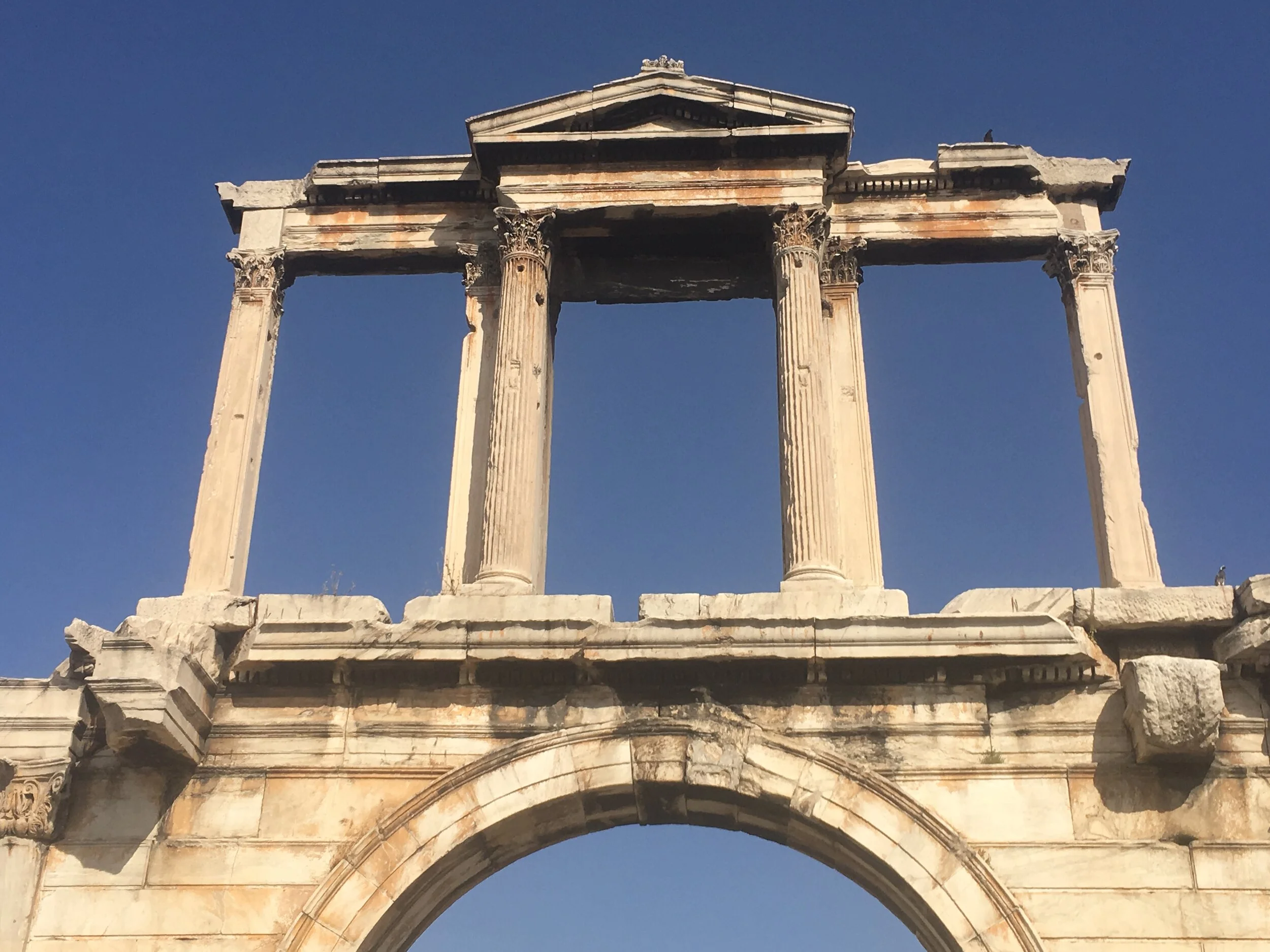 Ancient ruins with classical Greek-style columns and archway against a blue sky.