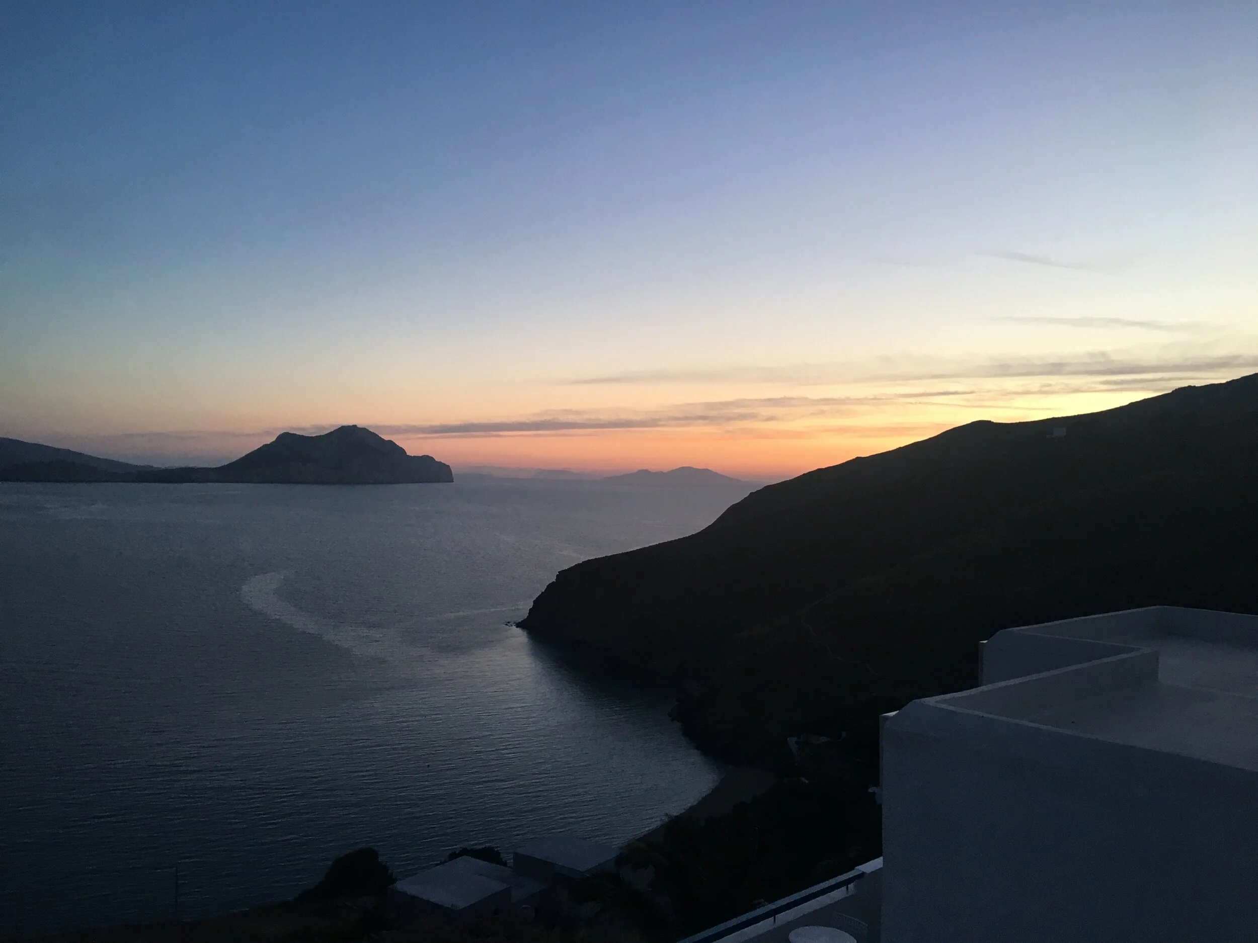 A scenic view of a coastline at sunset with a large island in the water and dark hills on the right side.