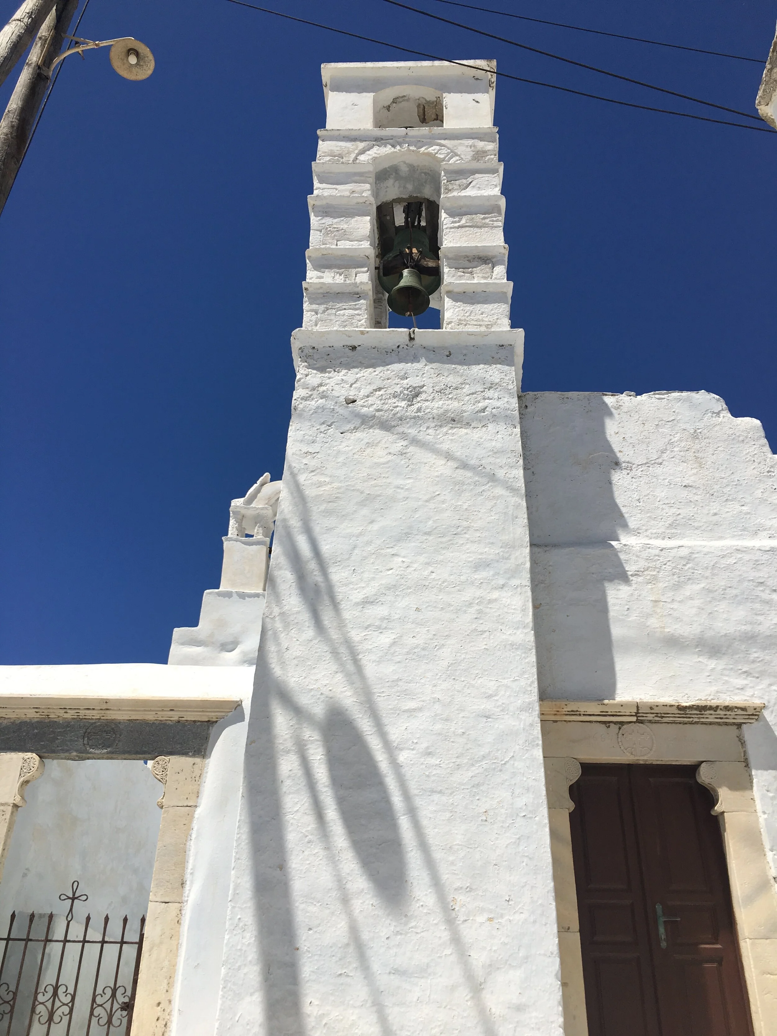 A white church bell tower with a small bell inside, set against a clear blue sky. The tower is attached to a white building with a dark brown door and decorative stone accents.