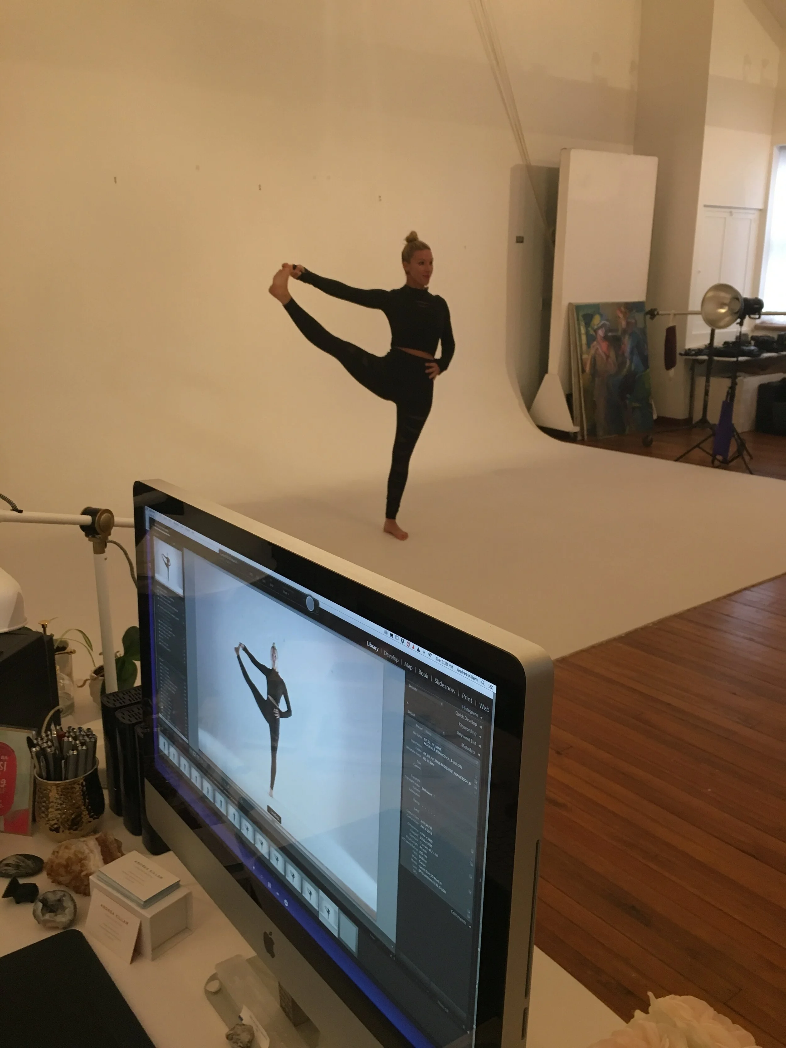 A woman in black performing a dance or yoga pose in front of a white backdrop, with editing software visible on a computer screen in the foreground.