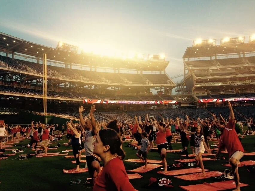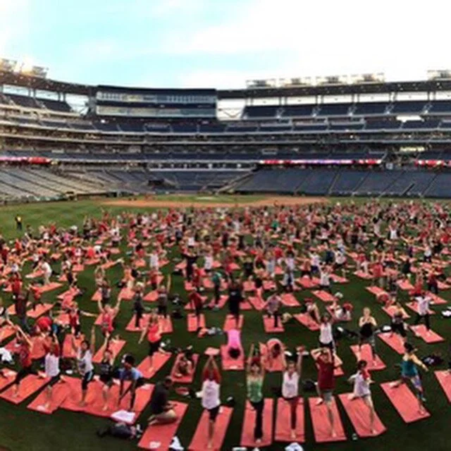 Large group of people participating in yoga class on a baseball stadium field, practicing yoga on pink mats.