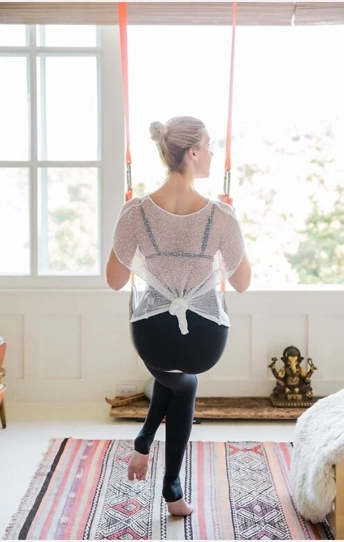 A woman sitting on a swing in a bright room with large windows, surrounded by colorful decor and natural light.