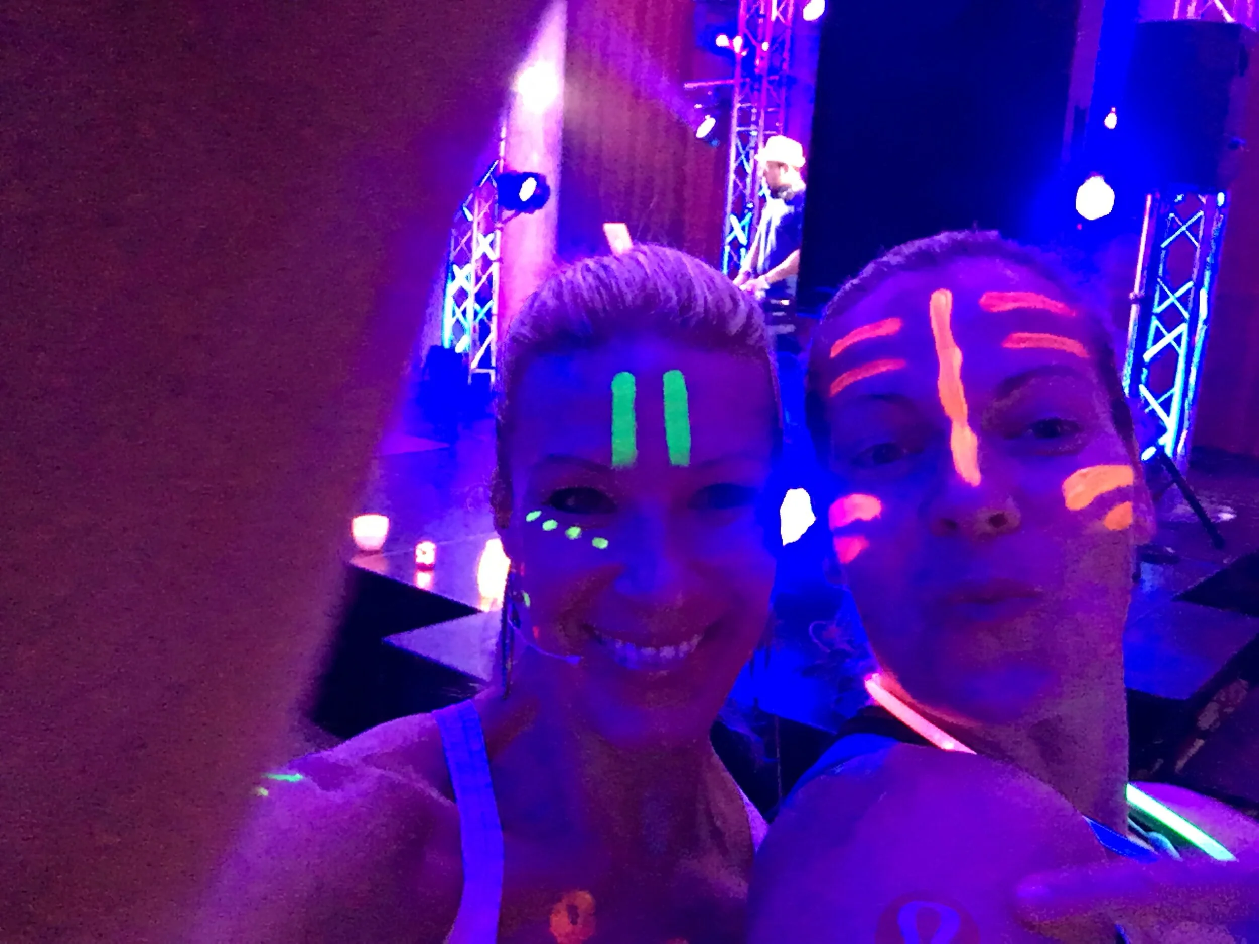 Two women with face paint glowing under blacklight at a concert or party, with a DJ in the background.