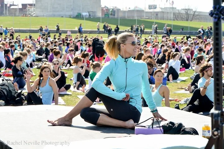 Large outdoor yoga event with many participants in seated forward bend pose on mats; instructor or speaker on stage in the foreground with a blonde ponytail, wearing a blue top, facing the crowd.