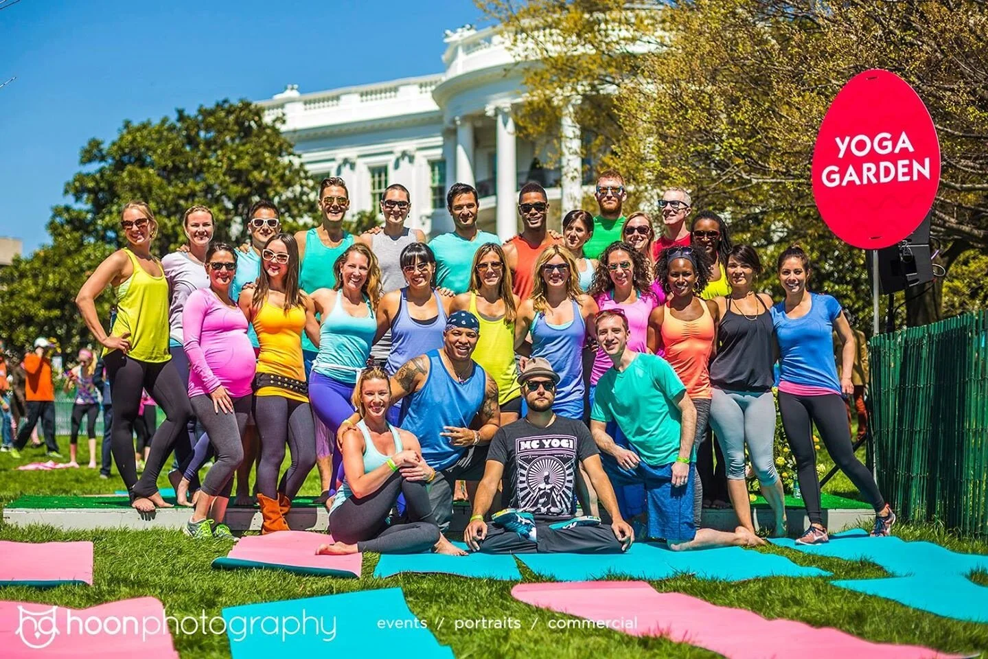 A group of people participating in a yoga event called 'Yoga Garden' outdoors on a sunny day, posing together on yoga mats in front of the White House.