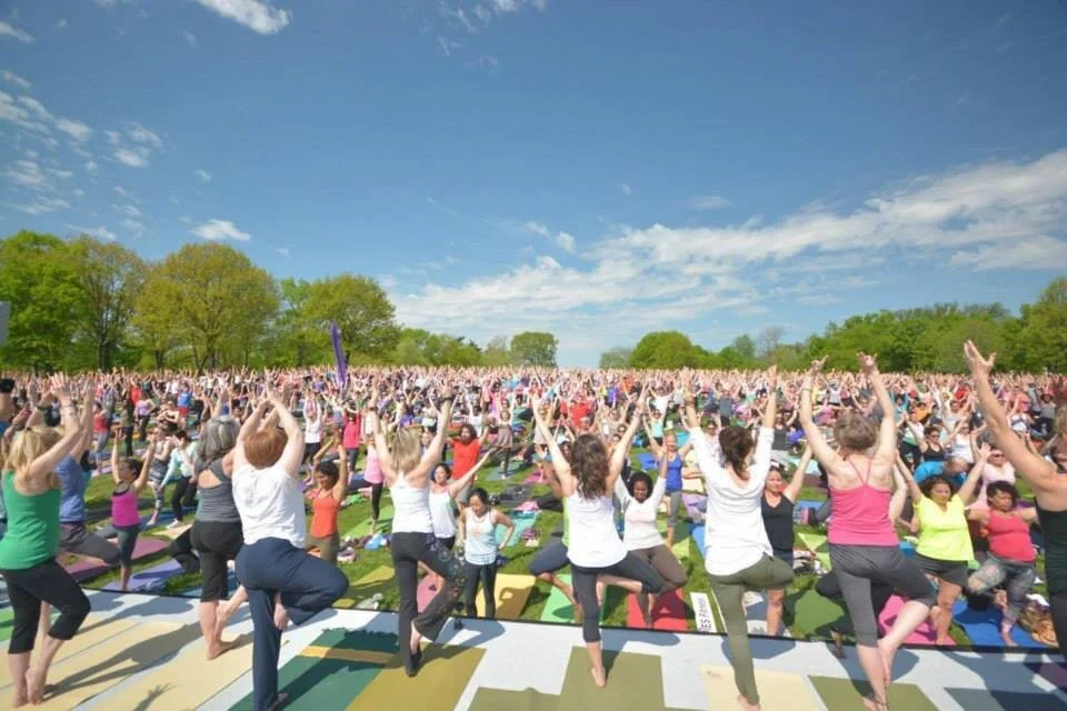 Large outdoor yoga class with numerous participants practicing yoga poses on mats under a blue sky with some clouds, surrounded by green trees.