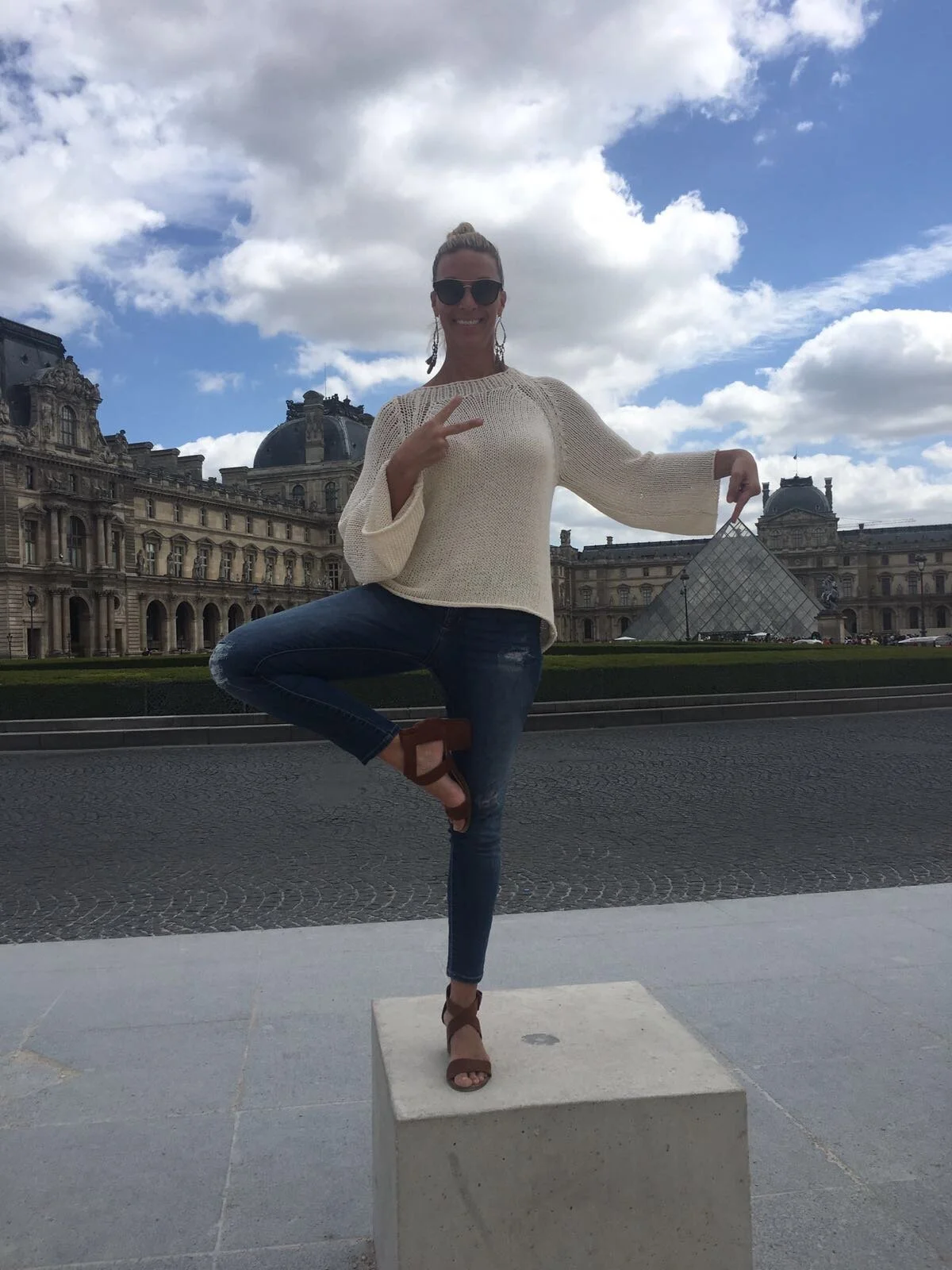 A woman posing for a photo on a small pedestal in front of the Louvre Museum in Paris, France. She is balancing on one foot, making a peace sign with her hand, and holding a shopping bag. She is wearing sunglasses, a cream sweater, ripped jeans, and