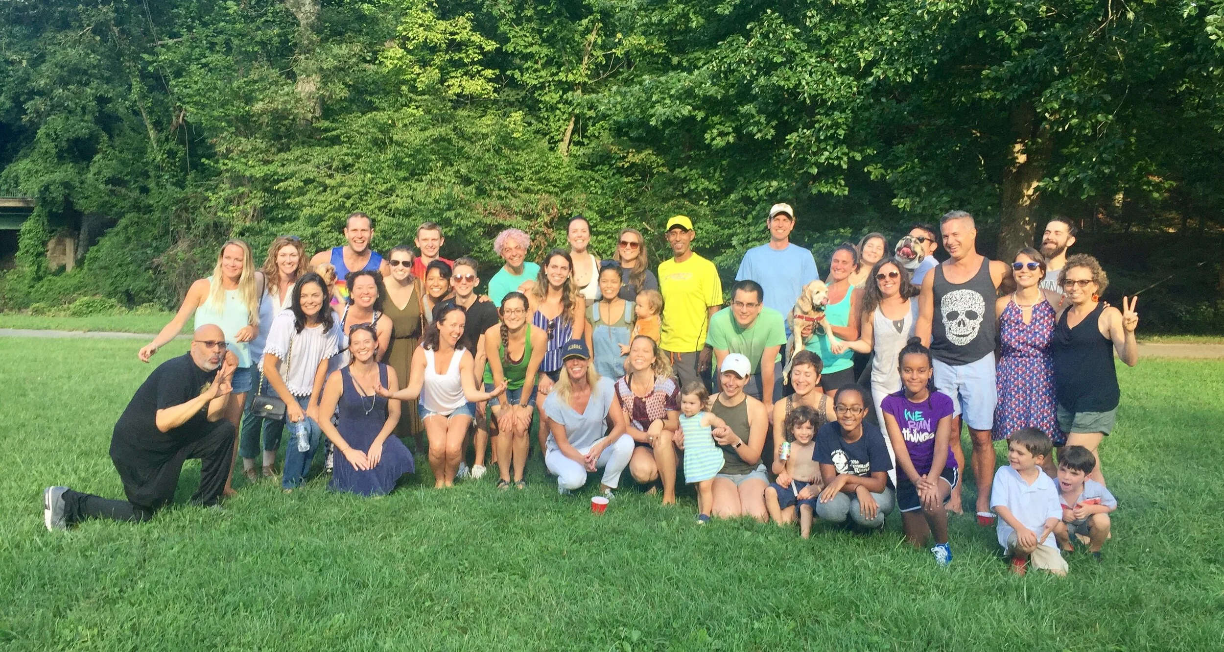 Group of people outdoors in a park, posing for a photo on a grassy area with trees in the background. The group includes adults and children, some sitting on the grass, others standing, smiling, and making peace signs.