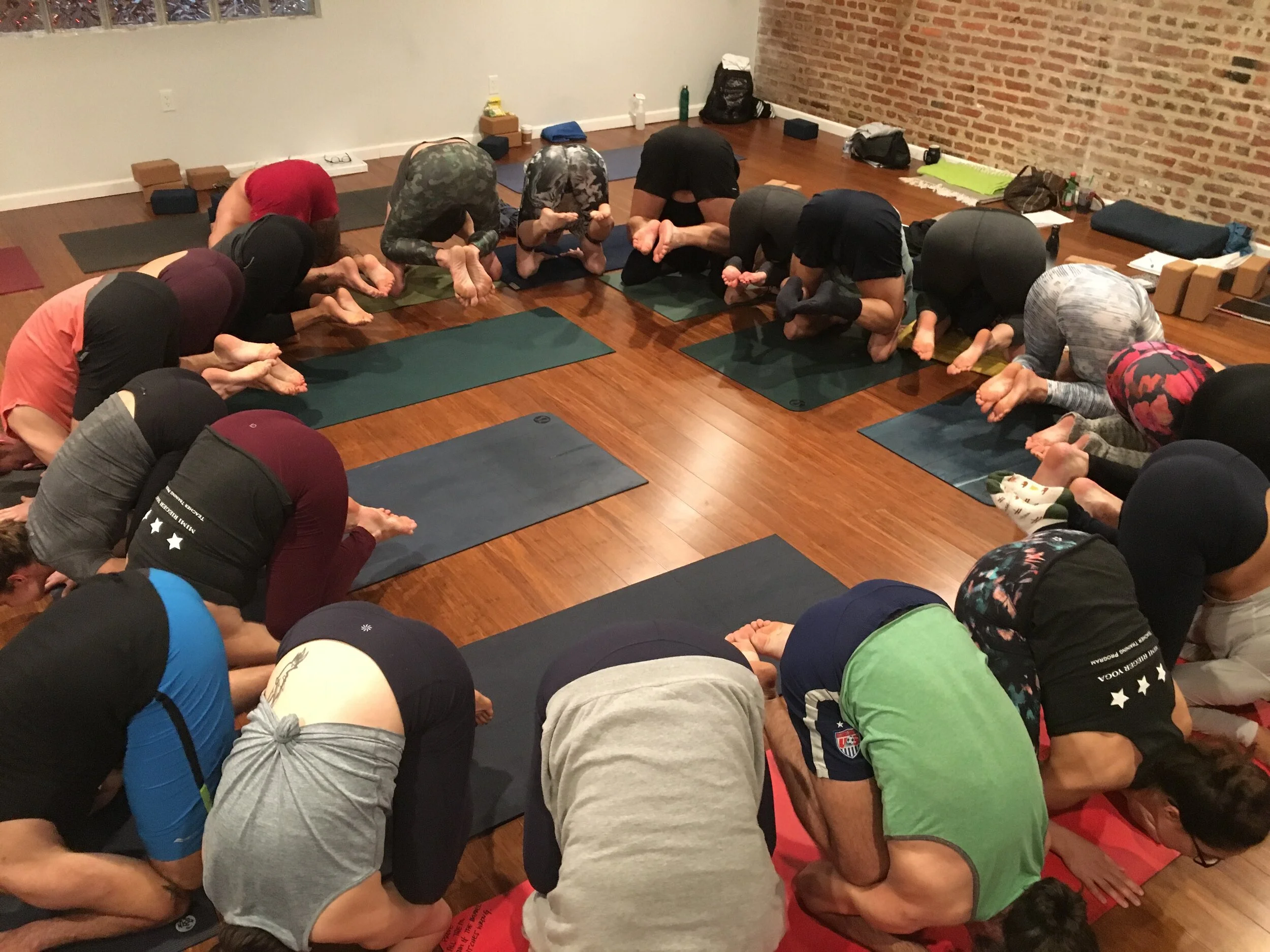 Group of people practicing yoga in a studio with wooden floors, brick wall, and yoga mats.