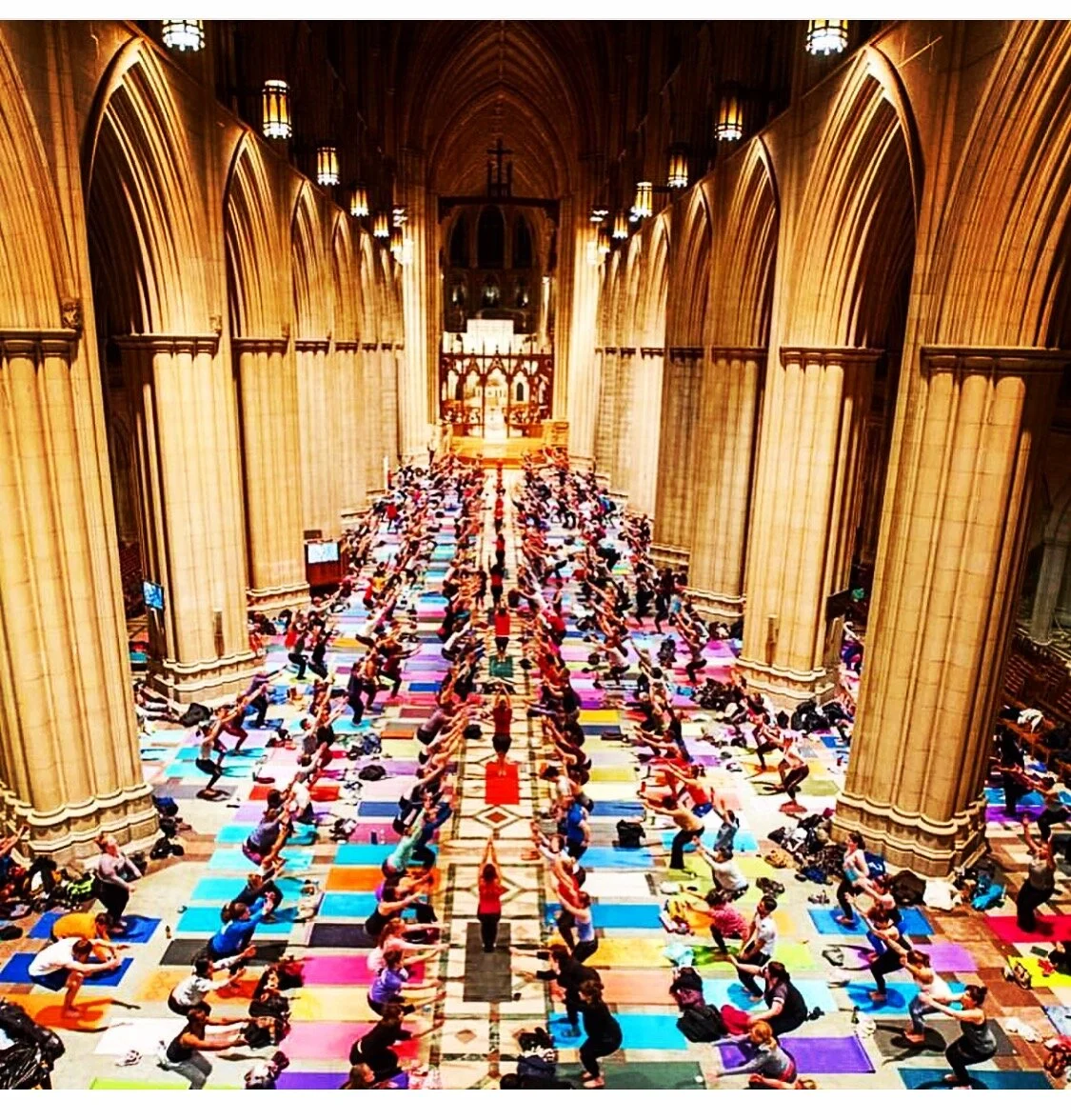 A large group of people practicing yoga in a cathedral-like structure with high vaulted ceilings and tall arches, standing on colorful mats arranged in rows.