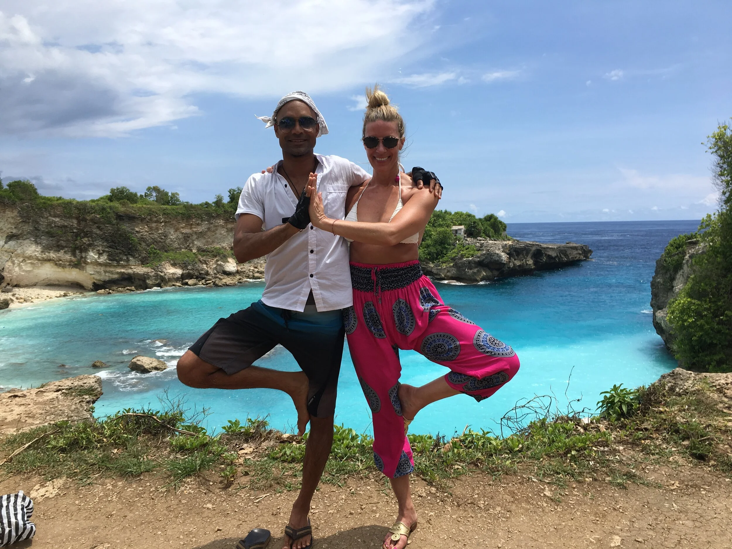 A man and a woman practicing yoga together on a cliff's edge overlooking a turquoise ocean and rocky shoreline, with partly cloudy skies.