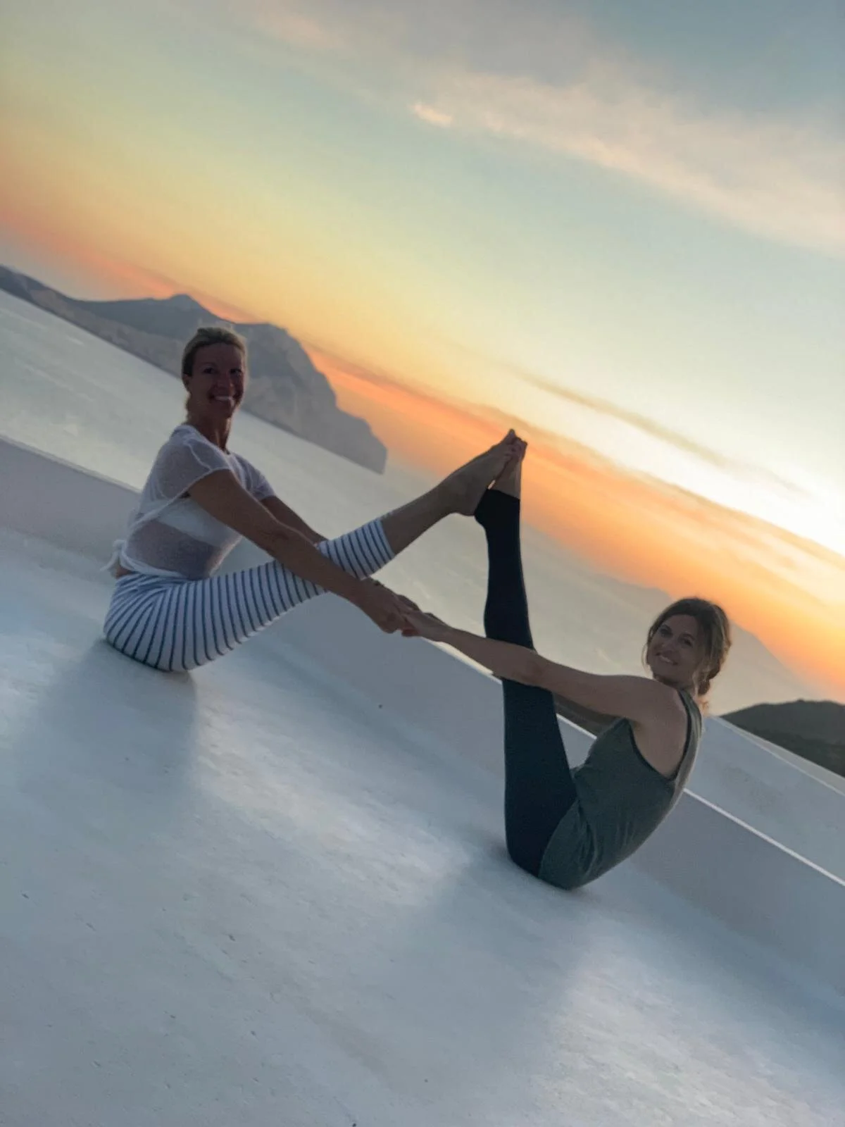 Two women practicing acro yoga or partner yoga during sunset on a rooftop with a scenic view of mountains and water.