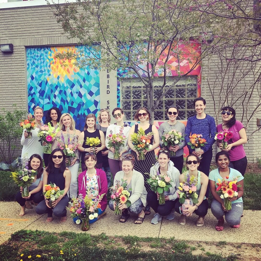 Group of women holding bouquets of flowers in front of a decorated brick building with a tree.
