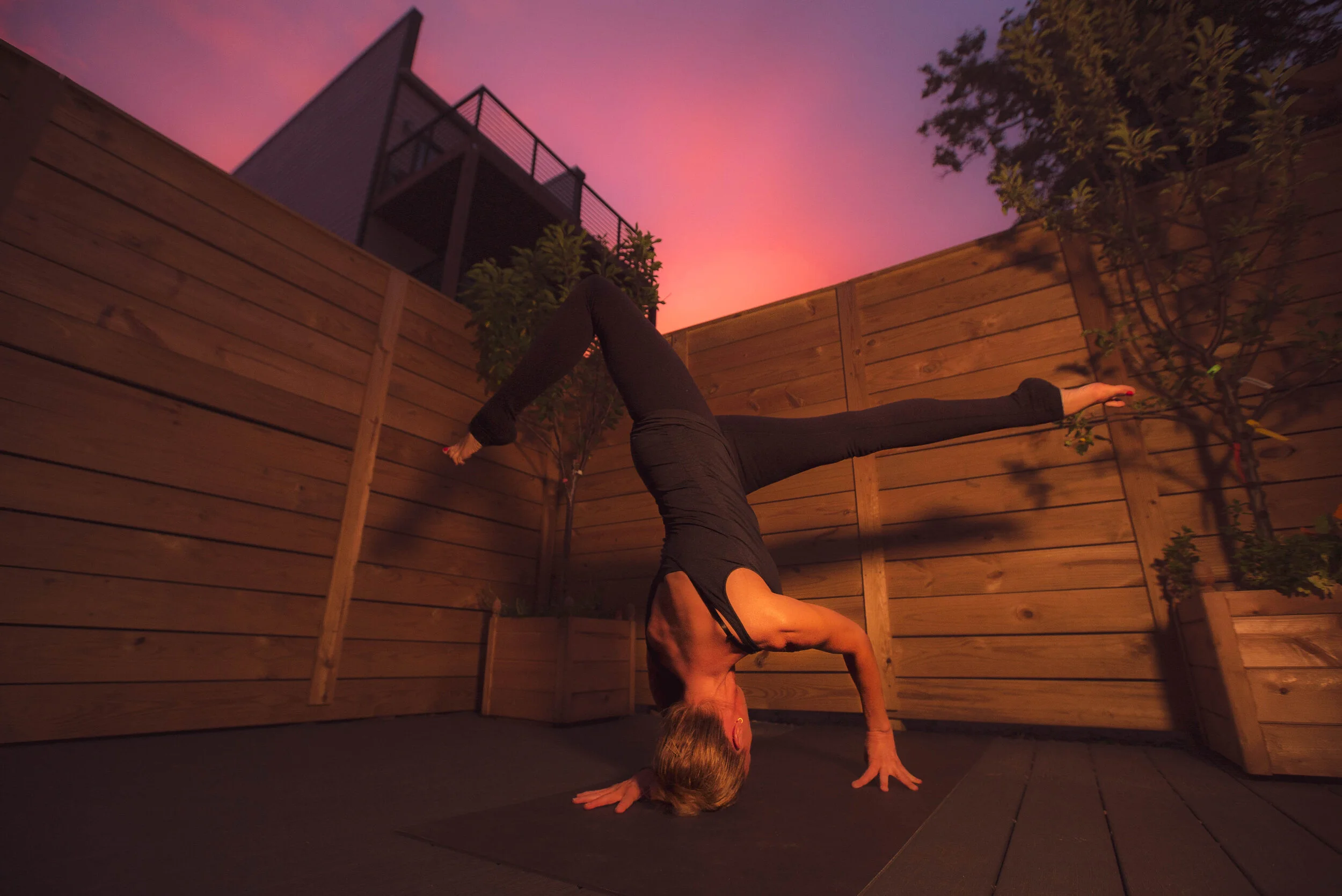 A woman practicing yoga outdoors at sunset, performing a headstand against a wooden fence, with trees and a building in the background.