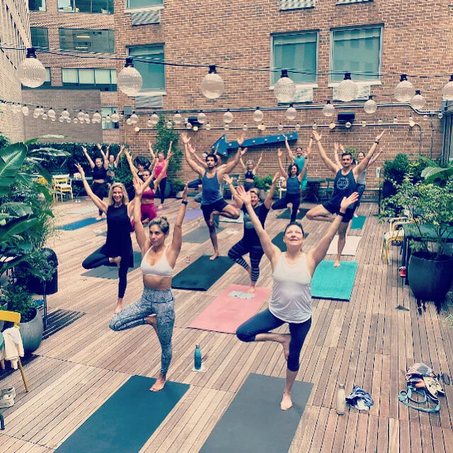 Group of people practicing yoga on a rooftop deck with string lights overhead and city buildings in background.