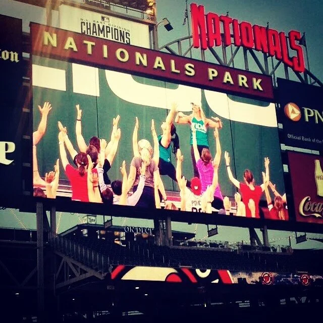 Large digital billboard at Nationals Park stadium showing a group of people participating in a celebration or event, with some holding objects and raising their hands.