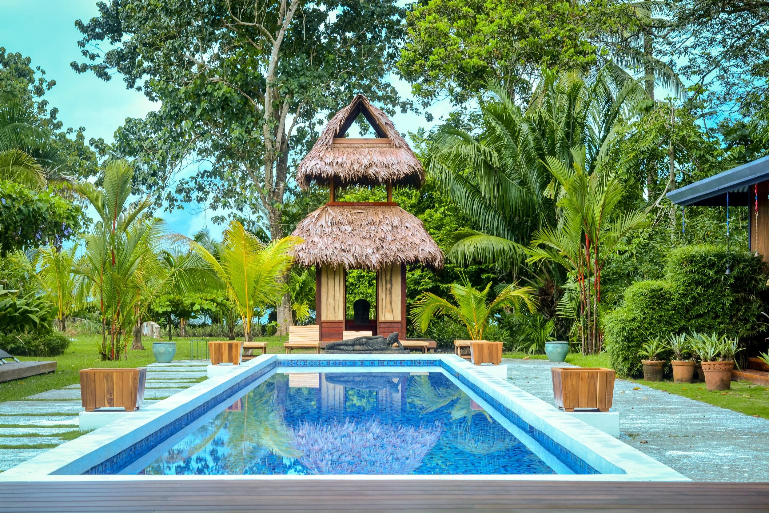 A tropical backyard with a swimming pool surrounded by lush green plants and trees, featuring a small thatched hut and several potted plants.