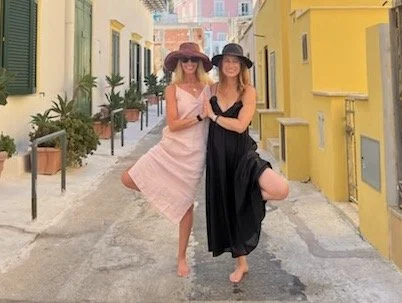Two women are doing a yoga pose on a rooftop at sunset, overlooking the ocean and hills in Santorini, Greece.